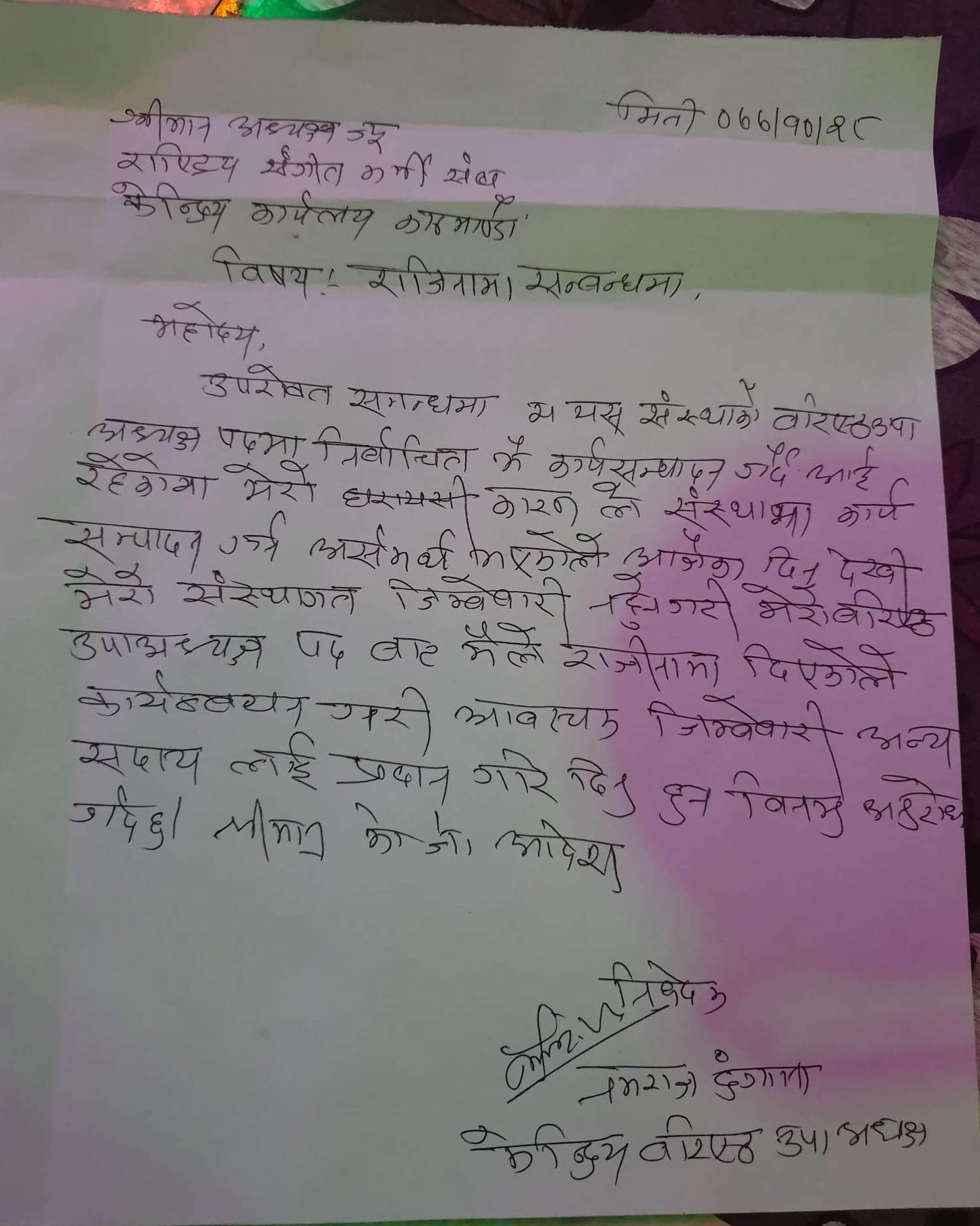 काठमाडाैं । राष्ट्रिय संगितकर्मी संघका वरिष्ठ उपाध्यक्ष नमराज ढुंगानाले राजीनामा दिएका छन् । २०६२ सालदेखी निरन्तर संस्थाको हक हितको लागि निरन्तर लागि परेका ढुंगानाले घरायसी कारण देखाउदै राजीनामा दिएका हुन् ।