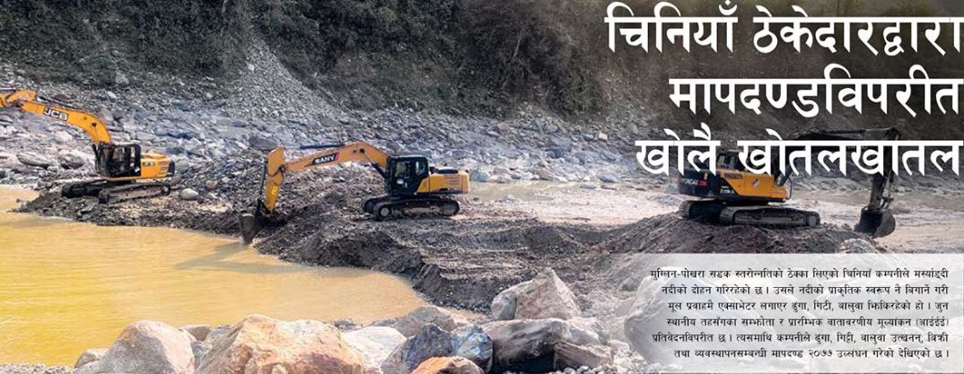 गोरखा । चिनियाँ निर्माण कम्पनी चाइना कम्युनिकेसन्स कन्स्ट्रक्शन कम्पनी (सीसीसीसी)ले मर्स्याङ्दीको मूल प्रवाहमै अवैध रूपमा एक्साभेटर लगाएर ढुंगा, गिटी, बालुवा उत्खनन गरिरहेकाे छ ।