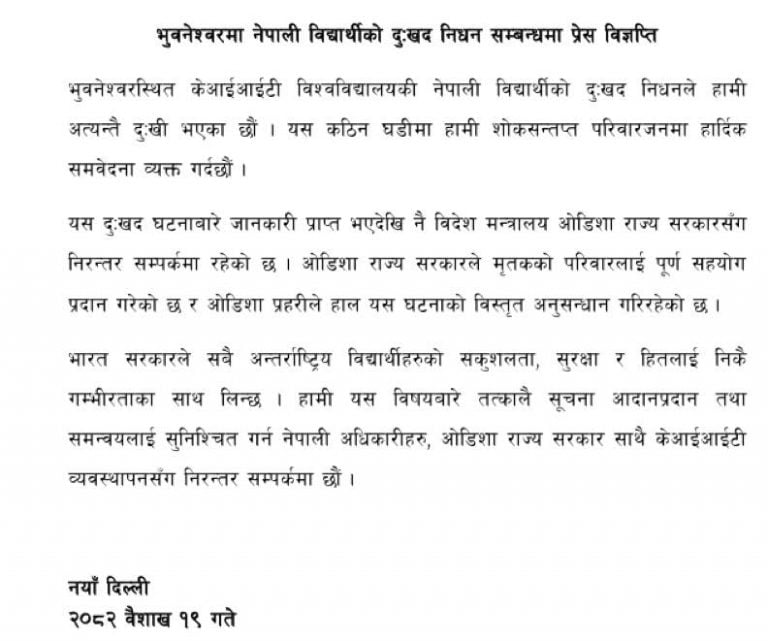 उडिसा सरकारले पीडित परिवारलाई पूर्ण सहयोग प्रदान गरेकोसमेत उल्लेख छ। ‘सरकारले सबै अन्तर्राष्ट्रिय विद्यार्थीहरूको सुरक्षालाई अत्यन्त गम्भीरताका साथ लिने बताएको छ। नेपाल सरकार, उडिशा राज्य सरकार र कीआईआइटी विश्वविद्यालय प्रशासनसँग निरन्तर समन्वयमा रही सूचनाको तत्काल आदानप्रदान र आवश्यक सहयोगका लागि तयारी अवस्थामा रहेको पनि छ,’ विज्ञप्तिमा भनिएको छ।